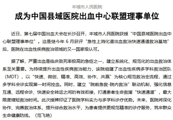【江西日报】丰城市人民医院成为中国县域医院出血中心联盟理事单位